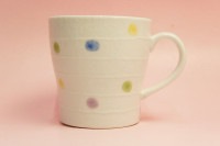 彩り鮮やかな水玉が可愛い、軽〜いマグ。 内面も真っ白なので、飲み物の色がキレイに見えます。 外面はキラキラと光沢があり、左手をそっと添えたくなるような緩やかな曲線が美しい。 電子レンジもOK