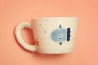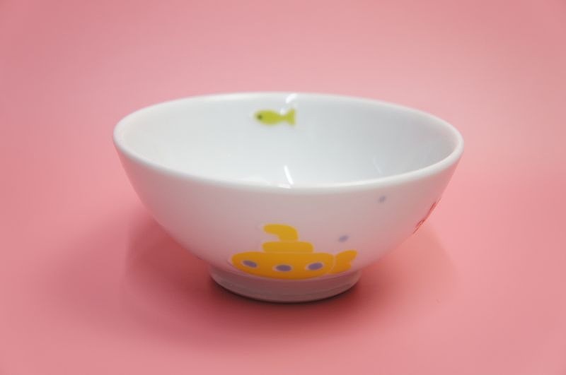 黄色い潜水艦から見た海の中を、磁器製のマグカップに楽しく表現しています。